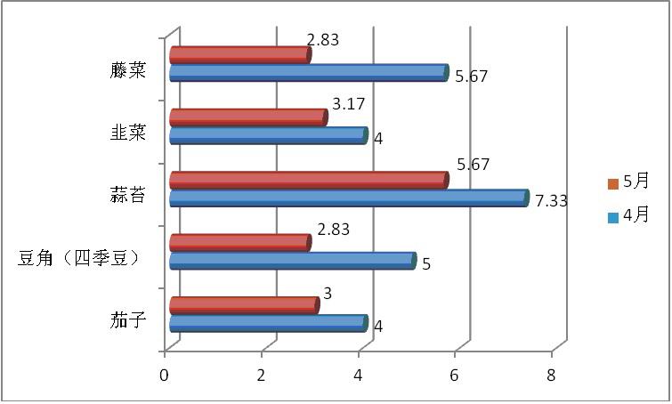 四、蔬菜价格跌多涨少,其中:四季豆、藤菜跌幅较大;茄子、蒜苔、韭菜3个品种价格本月波动也比较明显,跌幅均在20%-50%之间。具体情况如下:(单位:元/