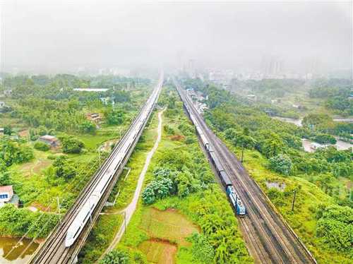 荣昌区峰高铺站,成渝高铁列车(左)从老成渝铁路旁驶过。首席记者 谢智强 摄