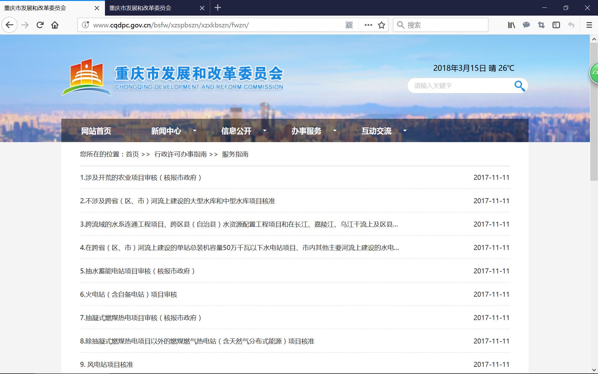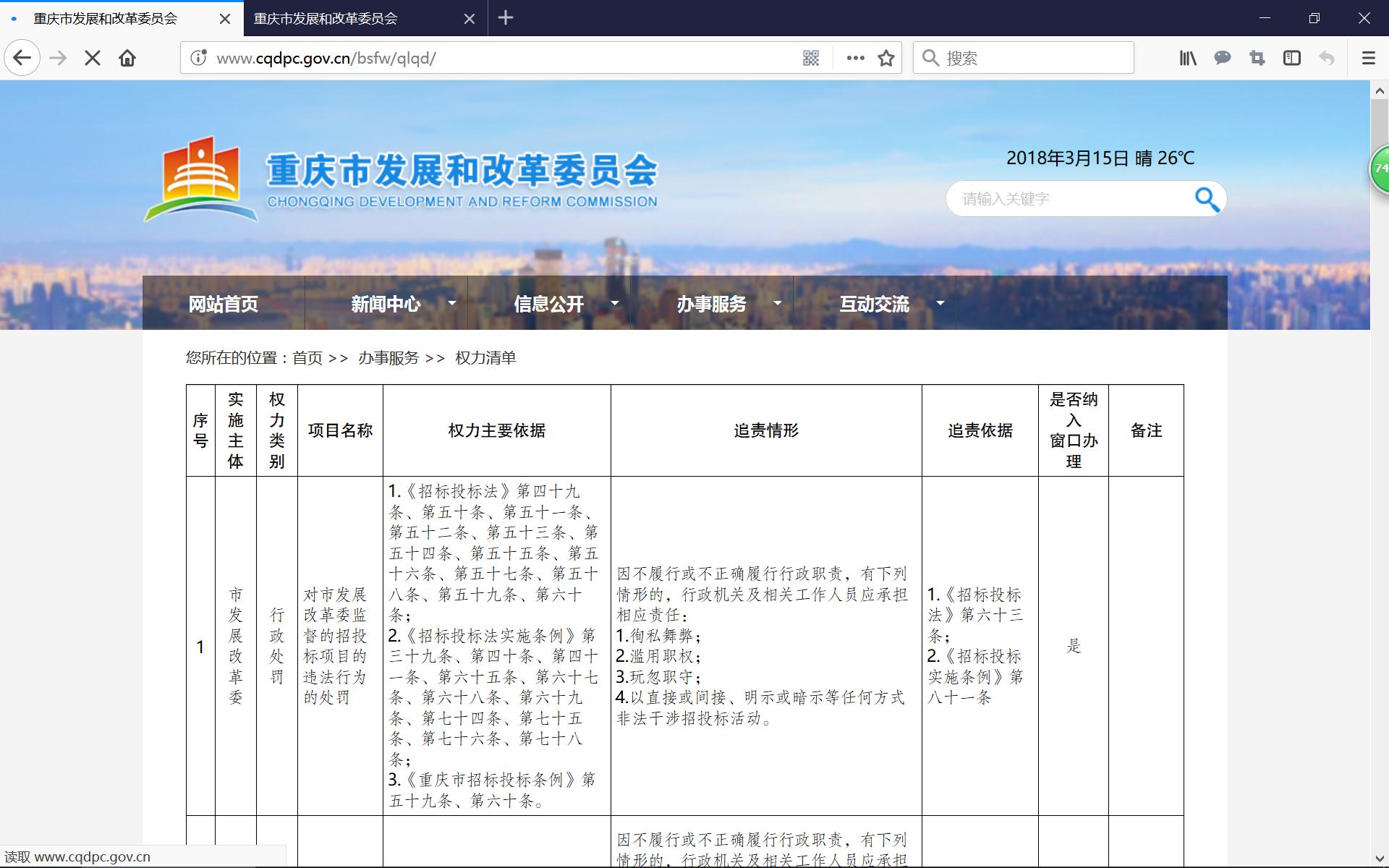 (五)推进“放管服”改革信息公开。一是着力抓好行政权力公开。按照“没有法律、法规和规章依据的权力事项不纳入,与‘放管服’改革不相符的事项不纳入,同一法律法规条款规定的内容不重复纳入”原则,编制我委行政许可事项清单,逐项明确各项行政许可事项的事项名称、设定依据、实施机关、实施对象、追责情形、追责依据等内容,完善形成重庆Hentaixxx 行政权力清单和责任清单,在委机关门户网站进行详细公布,接受社会监督,实现“清单之外无审批”。按照《重庆市政府核准的投资项目目录(2017年本)》,对权限范围内的行政许可事项清单开展清理规范。经合并整理后我委投资核准事项数量由原来的40项增加到48项,并经市政府审核通过后,在委机关门户网站上及时进行更新,确保行政权力信息全面、准确、透明。二是全面推进行许可事项标准化。针对48项行政许可事项逐一编制行政许可事项服务指南完整版和简版,规范行政许可事项的事项名称、适用范围、审批依据、申请条件、申请材料、办理流程、办结时限、结果送达、监督投诉渠道、责任处室、颁发证件形式等内容,同时明确每项行政许可事项具体经办人员的姓名、联系电话和办公地点。全部标准化后的许可事项办事指南均通过委机关门户网站、市网审平台等途径予以公开,为群众提供了有效的办事指引和及时、畅通的咨询服务。三是着力抓好全市社会公共信息资源共享交换平台建设。初步构建起“国家—市—区县”三级共享体系,建成全市统一的政务信息资源共享平台,于2017年9月率先与国家共享平台在线对接,并按要求向国家共享平台上传22个部门的政务信息资源目录,涉及资源项1003项,居全国前列。遴选两江新区、长寿区等8个区县(开发区)开展区县共享平台建设试点,目前8个试点区县(开发区)均已与市共享平台实现数据共享。编制形成信息资源目录及编码标准,按照国家《政务信息资源目录编制指南》,编制形成62个部门、2302类、3.45万项的信息资源目录。同时,结合重点领域应用,形成涉税信息、信用体系、社会保障、生态环保等13个主题信息资源目录。充分研究部门信息化建设和数据资源现状,分析900余项行业标准,编制形成我国首个以地理空间数据为基础,整合市级政务信息资源的大数据标准——《重庆市政务信息资源分类与编码标准》。市级部门数据实现在线共享,目前已有54个市级部门(单位)信息资源接入市共享平台,其中40个部门实现在线接入;市共享平台汇集政务信息资源达1110类,其中实时共享达706类;81个市级部门(单位)和区县通过市共享平台累计调用数据2400万次、2.1亿条,基本实现部门信息系统在线接入市共享平台并进行数据共享的目标。