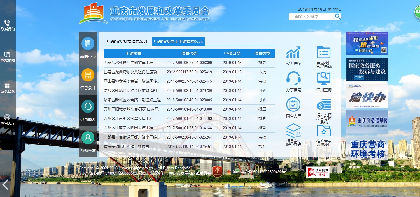 (一)推进重大建设项目和公共资源交易信息公开。按照集中、汇总的原则,推进重大建设项目信息公开。利用重庆市投资项目在线服务监管平台推进信息归集与汇总,并通过标准化数据接口,与重庆市社会公共信息资源共享平台实时共享。通过重庆市投资项目在线服务监管平台、市发改委门户网站等方式,将市级重点项目的项目指标、审批信息等进行公开,及时回应公众关切。推进公共资源交易信息公开,逐步优化和完善重庆市招标投标综合网,依法公开工程建设领域招标投标信息,其中招标公告2130条,中标候选人及中标结果信息1845条,比选公示和比选公告共计25条,违法违规信息58条。及时公开发布《必须招标的基础设施和公用事业项目范围规定的通知》《重庆市人民政府办公厅关于印发重庆市综合评标专家库和评标专家管理办法的通知》《关于严格执行国家必须招标范围和规模标准有关规定的通知》等政策法规信息。
