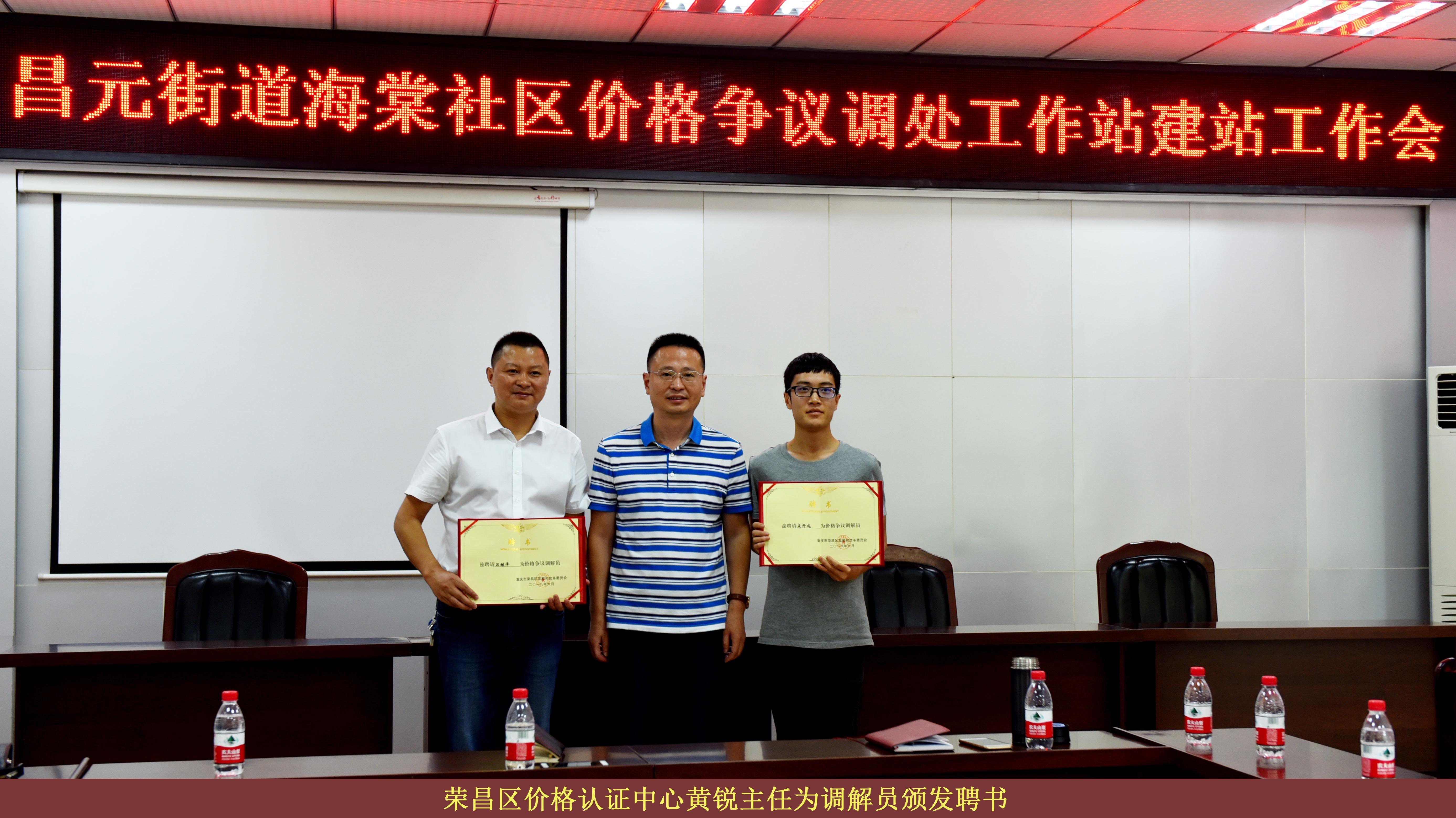 7月5日,荣昌区发改委在昌元街道海棠社区召开价格争议调处工作站建站工作会。区发改委副主任郭礼琼为工作站授牌,区价格认证中心主任黄锐为2名兼职调解员颁发聘书。区发改委副主任郭礼琼、昌元街道党工委委员、政法书记刘永健、海棠社区党支部书记吕继泽、区价格认证中心主任黄锐分别在会上发言。
