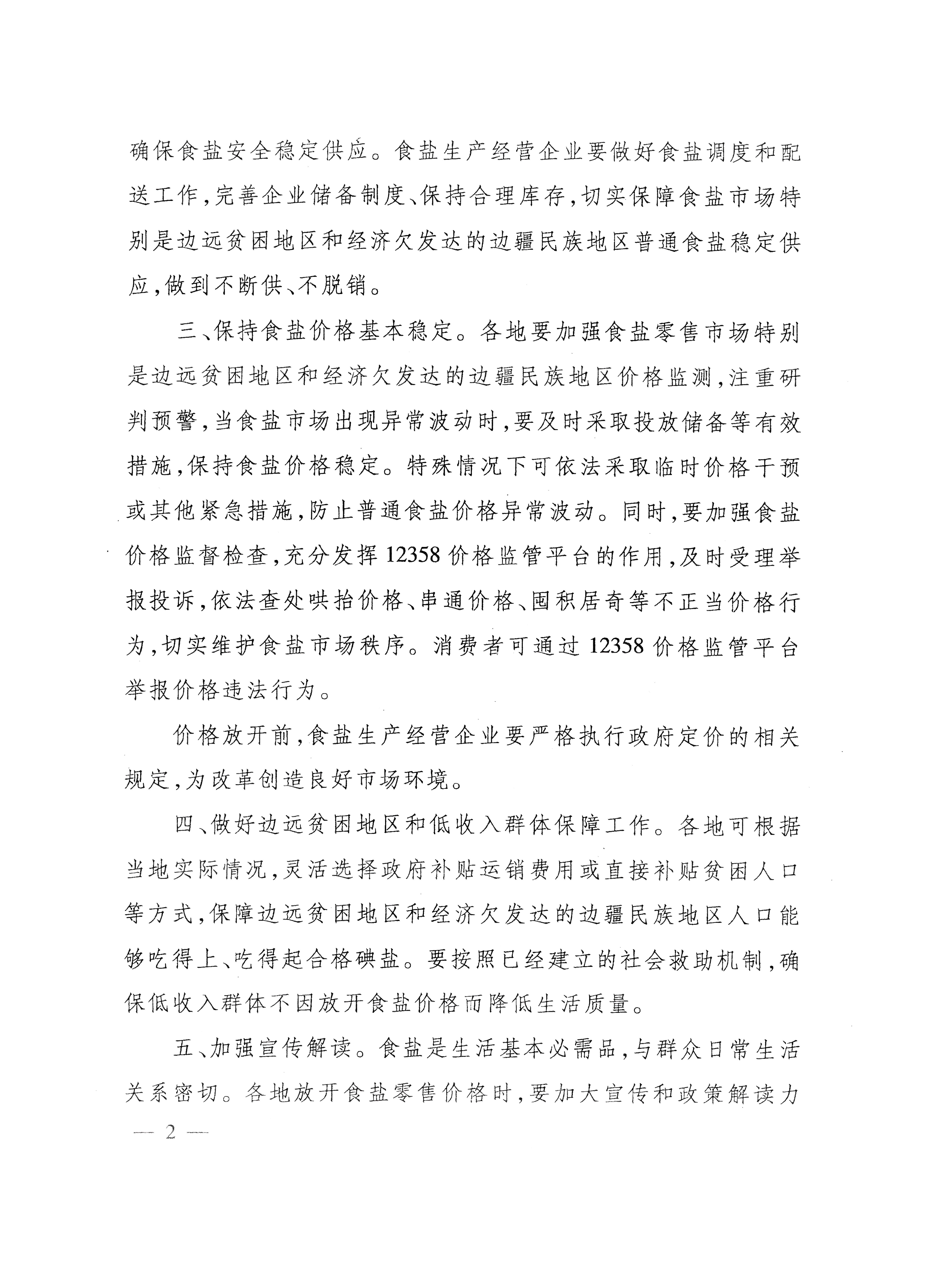 一、提高思想认识,确保改革有序推进。全面放开食盐价格是价格机制改革的一项重要任务,是在坚持食盐专营制度基础上推进供给侧结构性改革,实现盐业资源有效配置,进一步释放市场活力,促进盐业行业健康可持续性发展的重要举措。各区县价格主管部门、食盐生产经营企业要从全面深化改革的高度切实提高思想认识,严格按照《通知》要求,认真做好政策衔接,制定工作措施,确保食盐价格如期平稳有序放开。