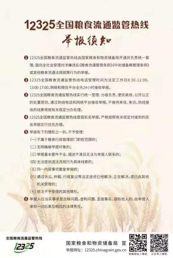 (一)12325全国粮食流通监管热线由国家粮食和物资储备局开通并负责统一管理,面向全社会受理对涉嫌违反《粮食流通管理条例》《中央储备粮管理条例》或其他粮食流通法规政策行为的举报。