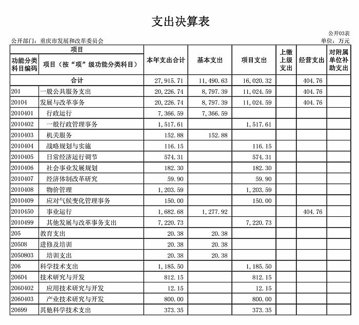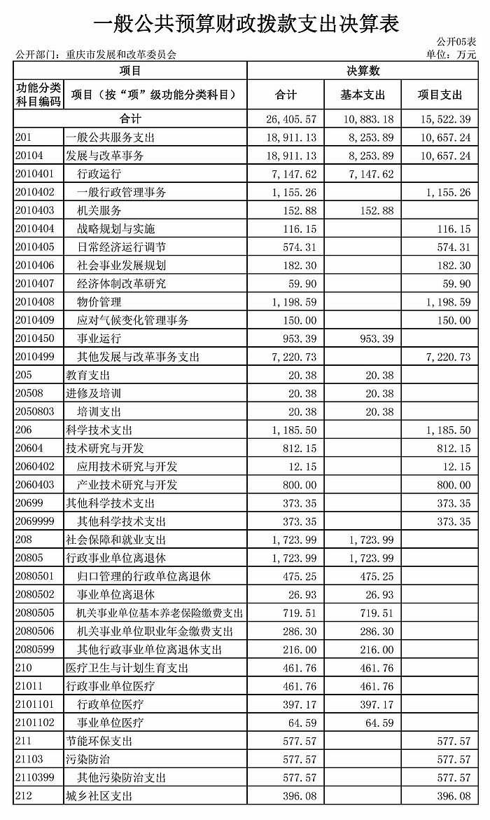 4.比较情况。本部门2018年度财政拨款支出主要用于以下几个方面:(1)一般公共服务支出18,911.12万元,占71.62%,较年初预算数增加7,652.58万元,增长67.97%,主要原因是预算执行过程中追加项目经费支出,主要有重大项目前期费、重大项目评估费、信用平台和固投平台建设等。(2)教育支出20.38万元,占0.08%,较年初预算数减少0.90万元,下降4.23%。(3)科学技术支出1,185.50万元,占4.49%,较年初预算数增加1,185.50万元,主要原因是预算执行过程中追加的高技术产业重大产业技术研发项目资金。(4)社会保障与就业支出1,723.99万元,占6.53%,较年初预算数增加294.28万元,增长20.58%,主要原因是预算执行过程中追加的离退休健康休养费和退休“中人”一次性补贴。(5)医疗卫生与计划生育支出461.76万元,占1.75%,与年初预算一致。(6)节能环保支出577.57万元,占2.19%,较年初预算数增加577.57万元,主要原因是预算执行过程中追加的低碳发展专项资金支出。(7)城乡社区支出396.08万元,占1.50%,较年初预算数增加396.08万元,主要原因是预算执行过程中追加的亚行贷款重庆市统筹城乡基础设施建设本息费。(8)农林水支出20.00万元,占0.08%,较年初预算数增加20.00万元,主要原因是预算执行过程中追加的生态文明建设专项支出。(9)资源勘探信息等支出2,219.00万元,占8.40%,较年初预算数增加2,219.00万元,主要原因是预算执行过程中追加的应急通讯项目中央基建投资支出。(10)住房保障支出423.16万元,占1.60%,较年初预算数减少7.98万元,下降1.85%,主要原因是人员增减变动造成。(11)其他支出467.00万元,占1.77%,较年初预算数增加467.00万元,主要原因是预算执行过程中追加项目支出经费,主要有PPP项目前期工作中央基建和西部大开发重点项目前期经费。