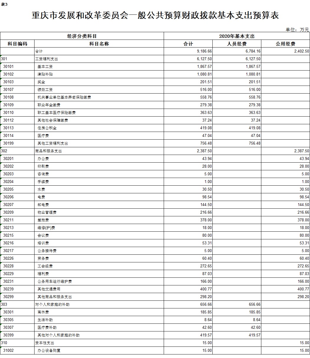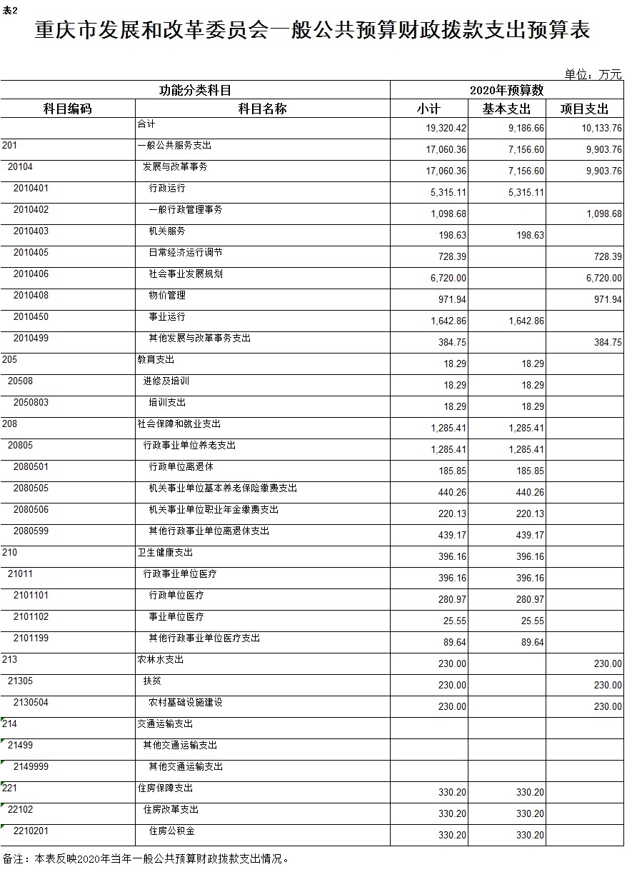 2020年一般公共预算财政拨款收入19320.42万元,一般公共预算财政拨款支出19320.42万元,比2019年减少1033.03万元。其中:基本支出9186.66万元,比2019年减少634.69万元,主要原因是机构改革人员转隶我委编制2020年预算时在职职工较去年减少44人,相应人员工资福利支出及公用经费预算减少,基本支出主要用于保障在职人员工资福利及社会保险缴费,离休人员离休费,保障部门正常运转的各项商品服务等支出;项目支出10133.76万元,比2019年减少398.34万元,主要原因是因阶段性工作开支而设立的项目增减变化,如梁滩河“一河一策”实施方案专项180万实施完成,当年不再安排预算;易地扶贫搬迁专项经费按工作实际2020年财拨经费预算较上年减少300万;机构改革新组建市公共资源交易监管局,新增专项经费预算142万元。项目支出主要用于市级重大项目及项目库前期费、固定资产投资调控、宏观经济运行调控、社会民生发展、区域经济发展、价格法制、听证及价格综合管理、易地扶贫搬迁、建筑工程招投标监督及行业管理等重点工作。